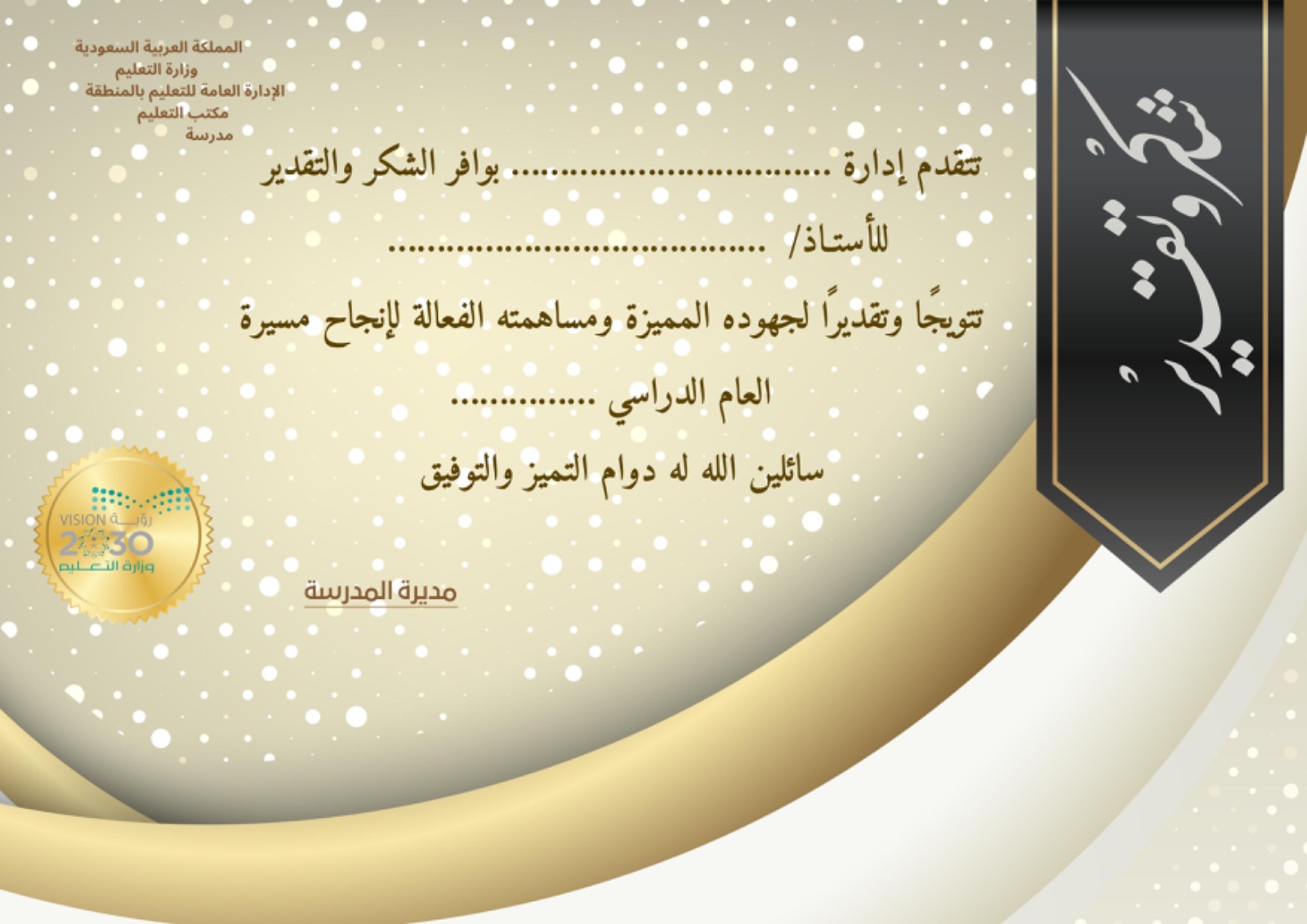 شهادة شكر وتقدير للأساتذة نموذج2