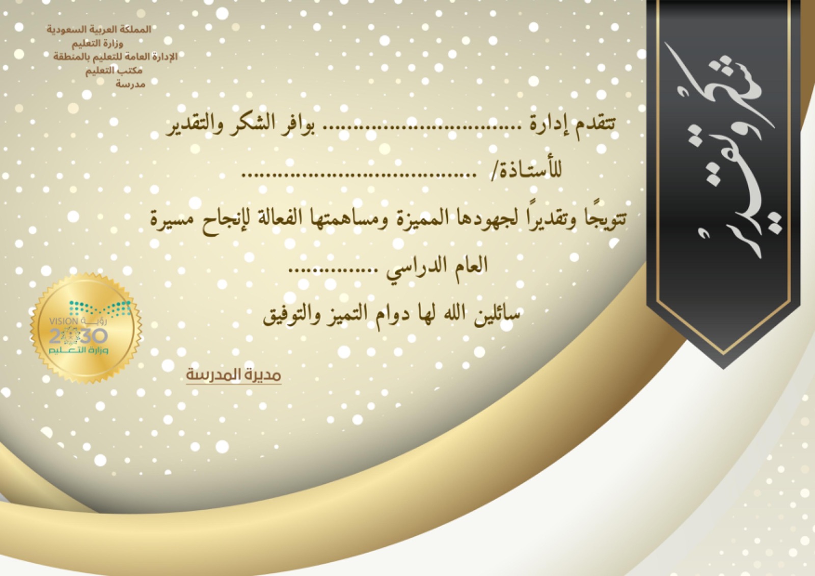 شهادة شكر وتقدير للأستاذات نموذج1