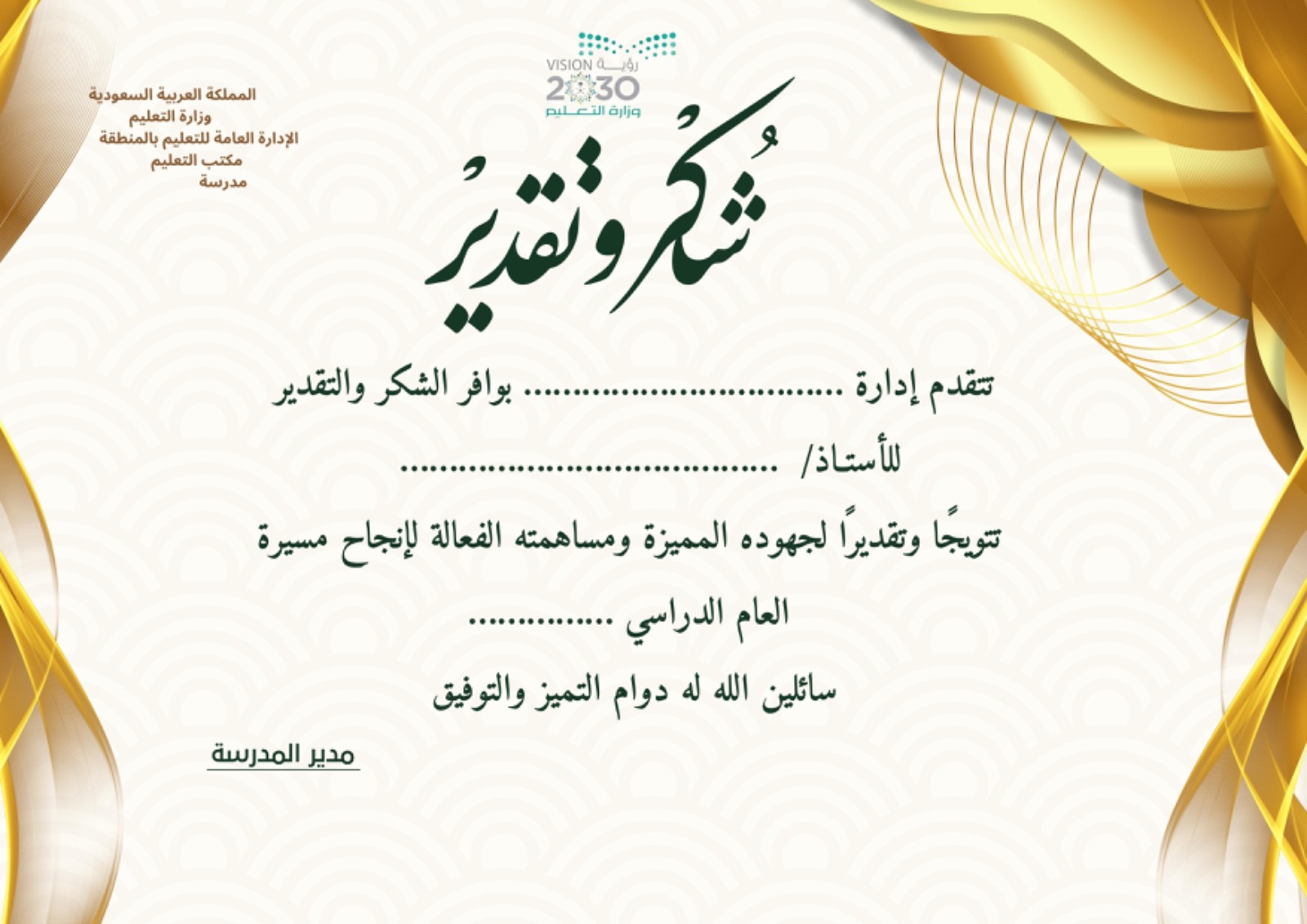 شهادة شكر وتقدير للأساتذة نموذج1